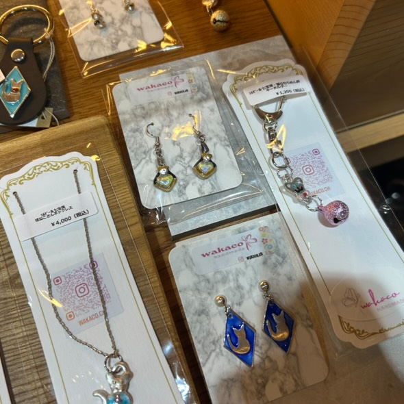 その中でも「majo cafe」さんは、美味しいカフェメニューを楽しみながら、アクセサリーやハンドメイド作品に出会える素敵なお店。今回、WAKACOの猫モチーフアクセサリーや七宝焼の作品も仲間入りしています。
